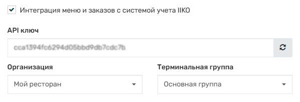 В окне настроек нужно включить галочку "Интеграция меню и заказов с системой учета IIKO" и указать ключ API полученный ранее при настройке Cloud Api веб-офиса iiko. Если ключ правильный, то появятся дополнительные поля для выбора организации и терминальной группы.
