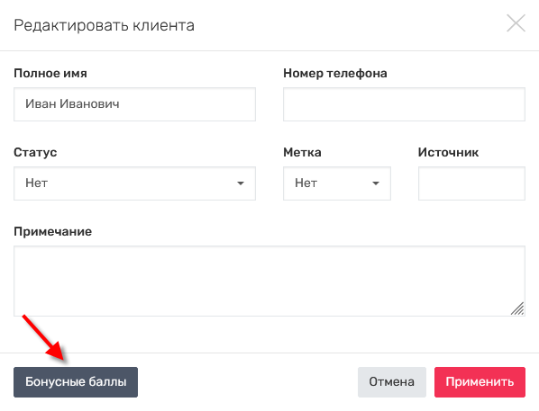 Бонусные баллы можно вручную добавить или списать у любого клиента. Для этого нужно в разделе "Клиенты" открыть окно редактирования клиента и нажать кнопку "Бонусные баллы".